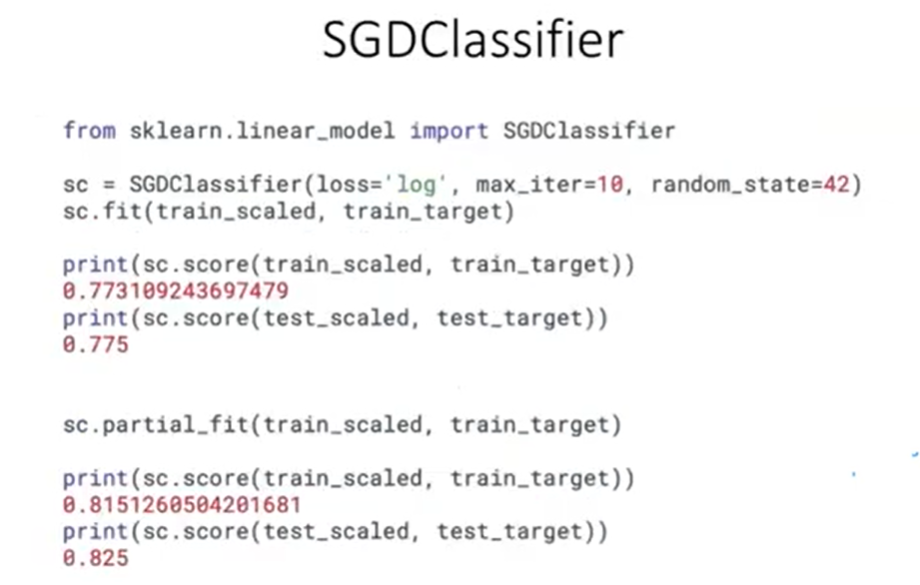 - 모델 생성: SGDClassifier를 로지스틱 회귀(loss='log')와 함께 설정