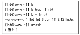 | umask | 파일, 디렉토리 생성 시 기본 권한 설정 |