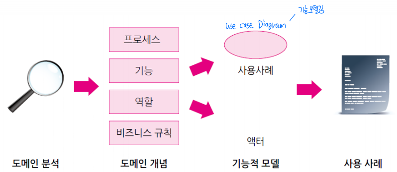 도메인 분석의 결과를 엑터(actor), 사용사례(use case), 관계(relation)들로 구성된 시스템 명세로 매핑하는 작업