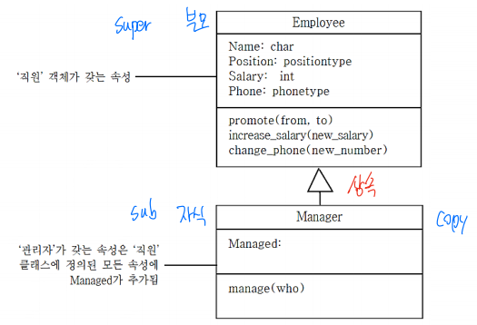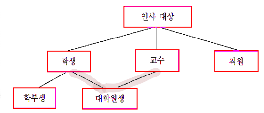 - 일반화된 개념의 클래스, 더 구체적인 개념의 클래스 사이의 관계