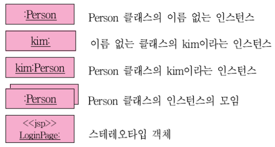 - 3개의 부분으로 나누고 위부터 차례대로 클래스 이름, 클래스 속성, 오퍼레이션