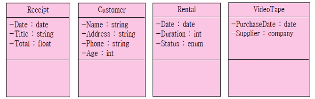 이름 - 객체 안에서 구별할 수 있는 속성의 이름 . 예를 들어 VideoTape은 PurchaseDate와 Supplier 속성을 가짐. PurchaseDate은 테이프를 구매한 날짜이며 Supplier는 비디오 공급업체를 나타냄