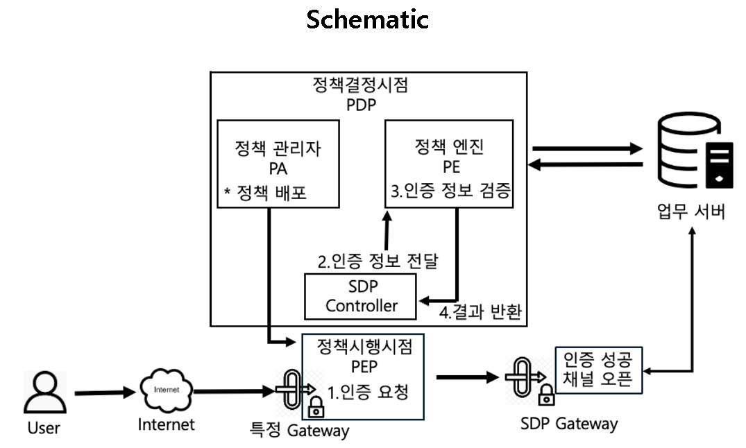 - 정책 실행 지점: 사용자 요청을 받아 SDP 컨트롤러로 전달, 컨트롤러로부터 받은 접근 결정을 집행