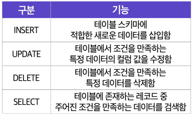 DML(Data Defintion Language): DDL로 정의된 데이터 구조에서 실제 데이터를 조작하는 언어(데이터 조작 언어)