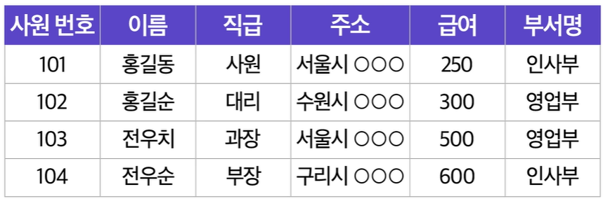 릴레이션 스키마 -> 사원 번호, 이름, 직급, 주소, 급여, 부서명