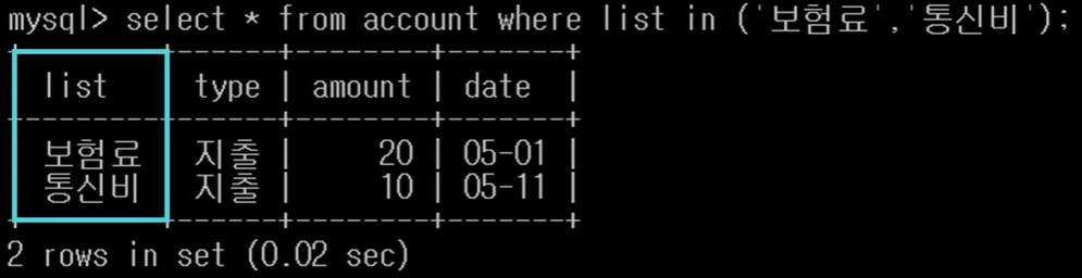 ex) account 테이블 중 'list' 칼럼에서 보험료와 통신비를 조회하고자 할 경우
