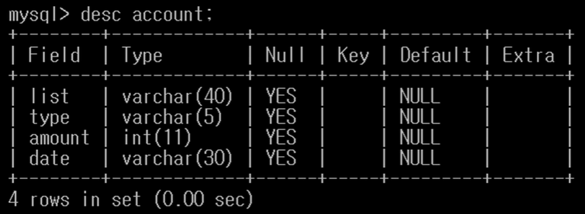 ex) account 테이블 중 지출 항목과 금액이 얼마인지 조회하고자 할 경우