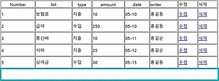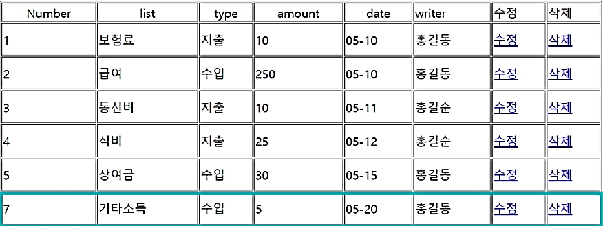 - 각 '삭제' 하이퍼링크는 해당 number 칼럼 기준으로 연동됨