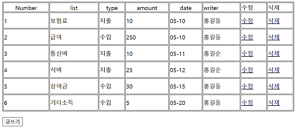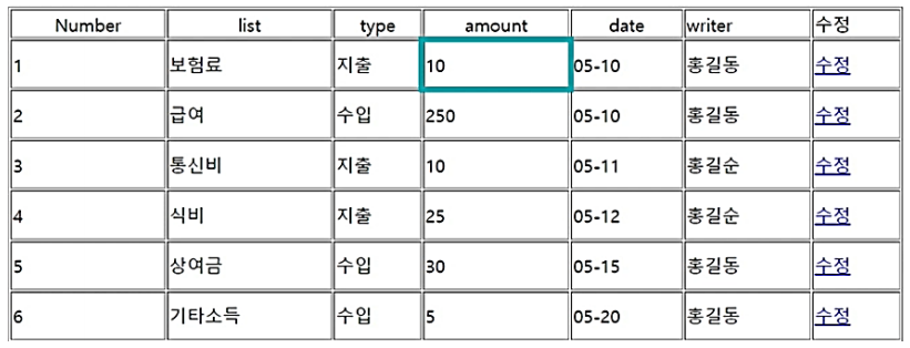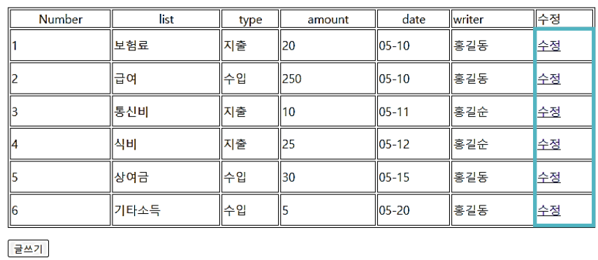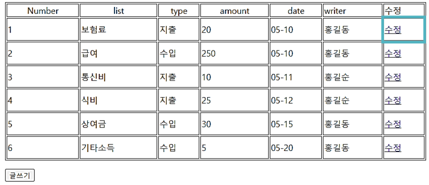 - 각 '수정' 하이퍼링크는 해당 number 칼럼 기준으로 연동