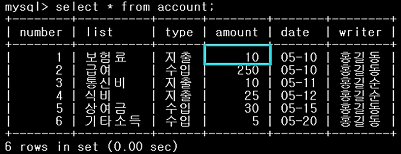 2) 1번 레코드 amount 숫자 변경 확인하기