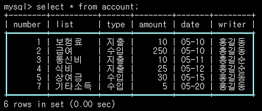 ex) 테이블에서 type에서 '지출'의 값에 대하여 합계를 구하고자 할 때