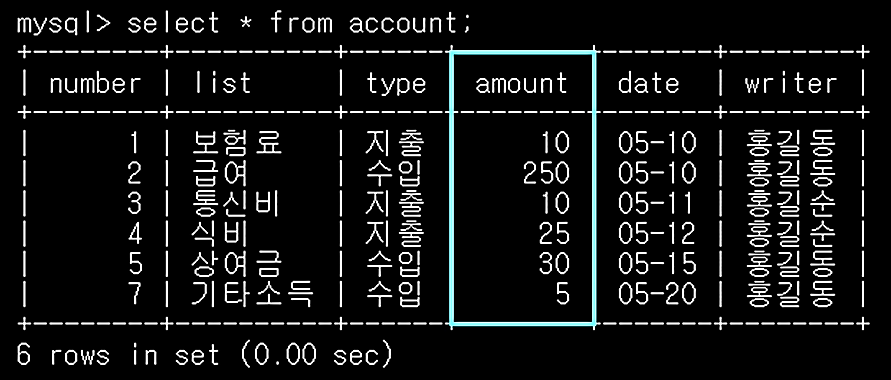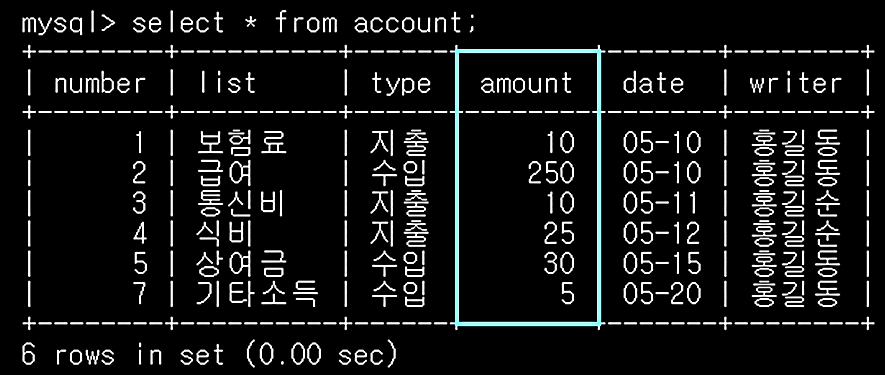 ex) 테이블에서 amount 칼럼의 합계를 구할 때