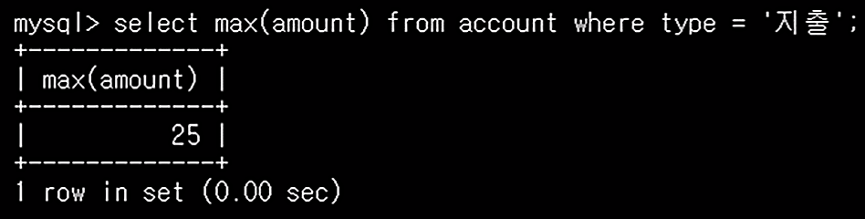 ex) type 칼럼 데이터에서 '지출' 중 amount 최댓값 찾기