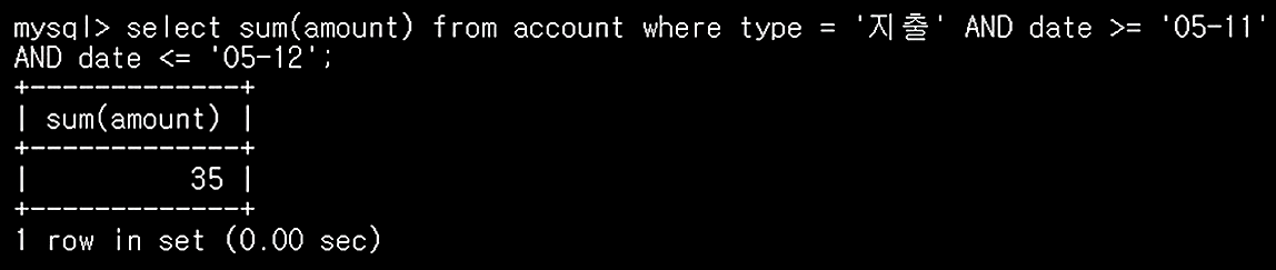 ex) 5월 11일 ~ 5월 12일 사이 발생한 ' 지출' 합계를 구할 때