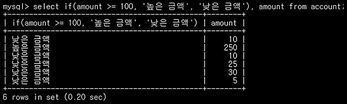 SELECT IF(amount >= 100, '높은 금액', '낮은 금액'),