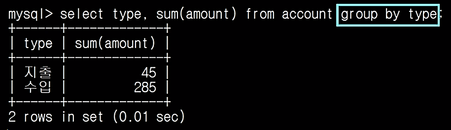 ex) type 칼럼을 기준으로 수입, 지출의 합계를 구하고자 할 겨웅