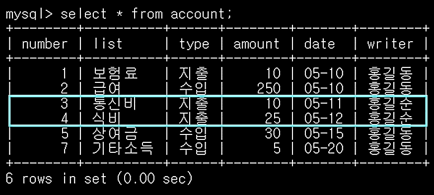 WHERE type = '지출' AND date >= '05-11' AND date <= '05-12';