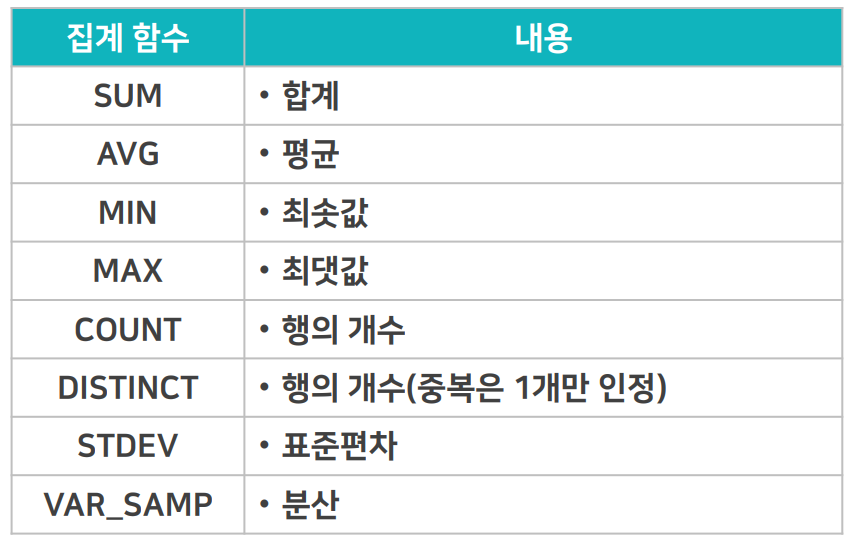 - DB 테이블의 여러 행으로부터 여러 행을 기반으로 연산된 결과값을 반환하는 함수