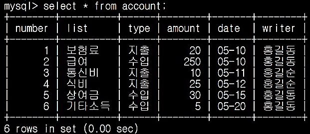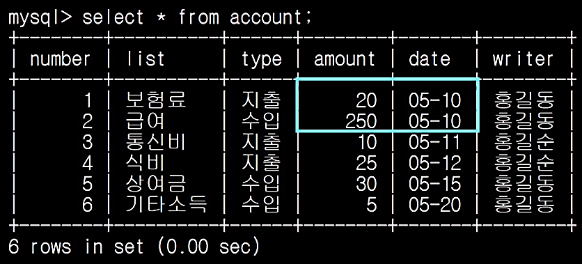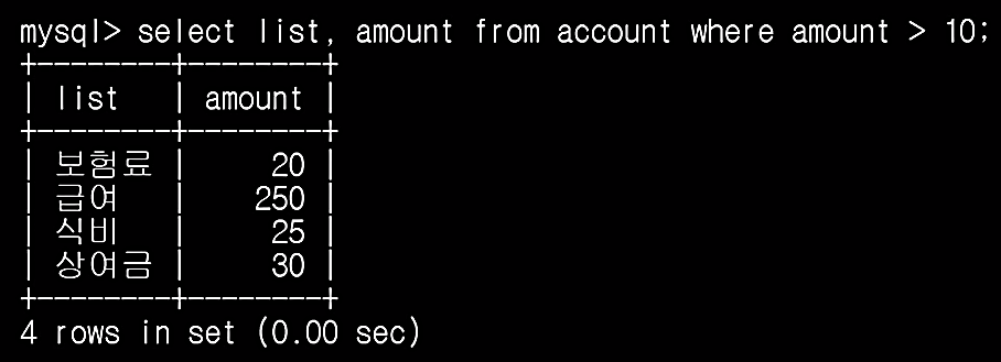 ex) account 테이블에서 amount 칼럼 값 중 10보다 큰 데이터를 출력할 경우