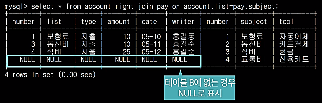 SELECT * FROM 테이블A RIGHT JOIN 테이블B