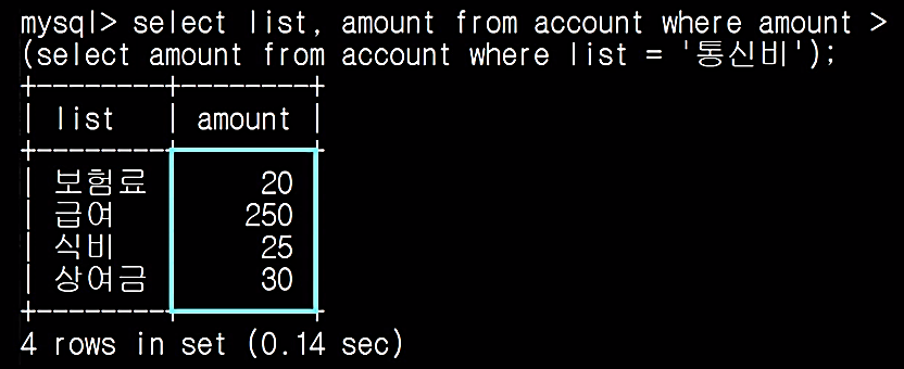 - 괄호 안의 조건에 부합되는 결과가 상위 칼럼의 조건으로 작용하여 쿼리를 실행