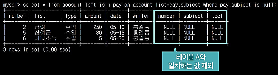 ON 테이블A.칼럼=테이블B.칼럼 WHERE 테이블A.칼럼 IS NULL;