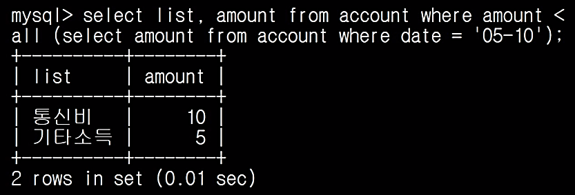 - 서브 쿼리에 해당하는 값이 복수일 때 ANY 또는 ALL의 옵션 미적용 시 에러가 발생