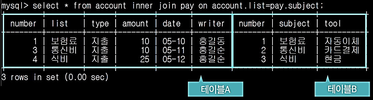 SELECT * FROM 테이블 A INNER JOIN 테이블B