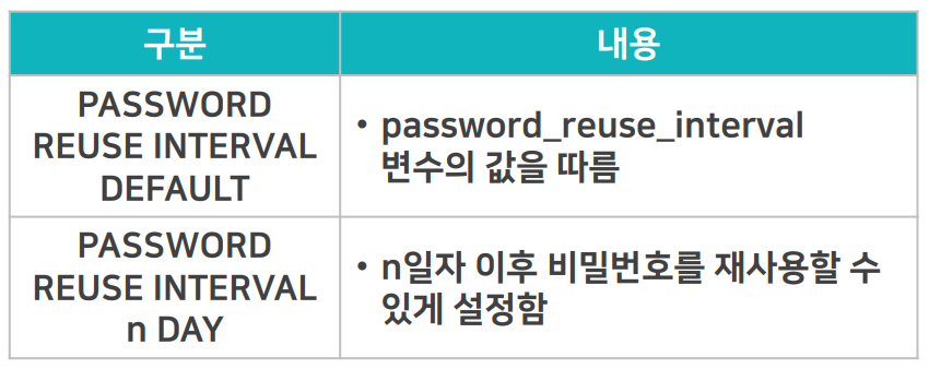 - 별도로 명시하지 않으면 password_reuse_interval 시스템 변수에 저장된 기간으로 설정