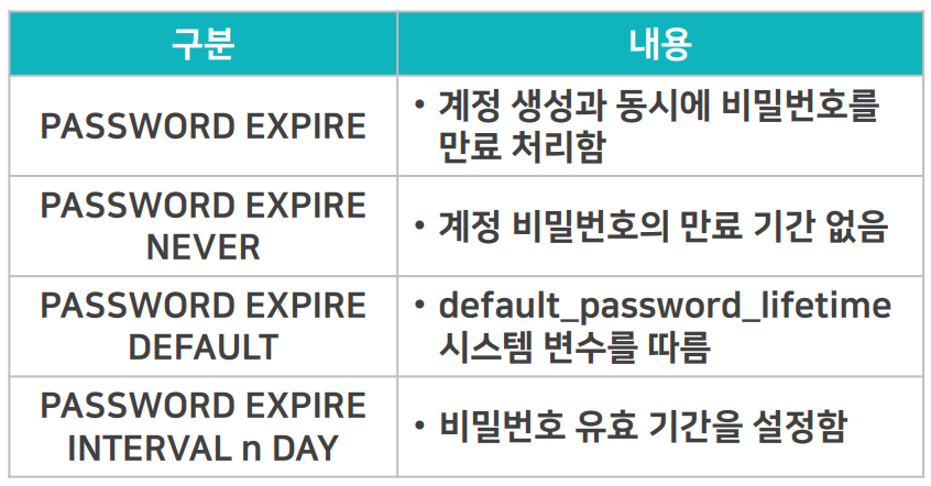 - 계정 생성 시 명시하지 않으면 default_password_lifetime 시스템 변수에 설정된 기간으로 설정