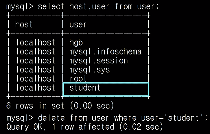 2) 계정 삭제 쿼리 실행