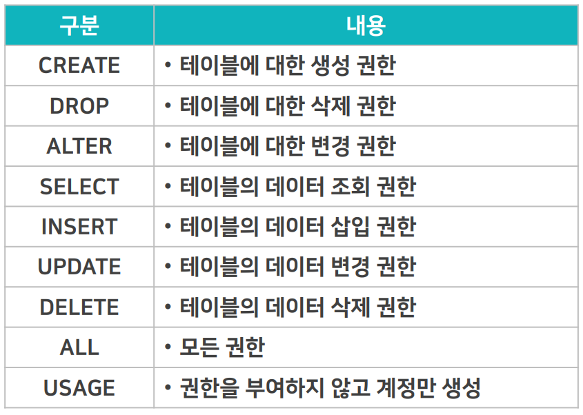 - 권한 부여는 GRANT 명령으로 구분