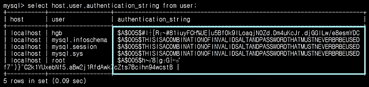 - 계정별 password는 authentication_string이라는 스키마에 저장됨