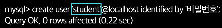 CREATE USER '계정아이디'@localhost IDENTIFIED BY '비밀번호';