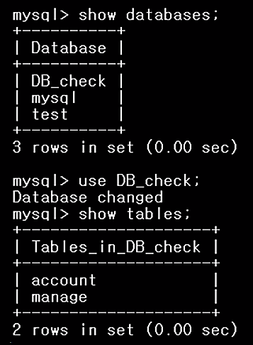 1) 'test'라는 DB에 두 개의 테이블(account, manage)이 존재