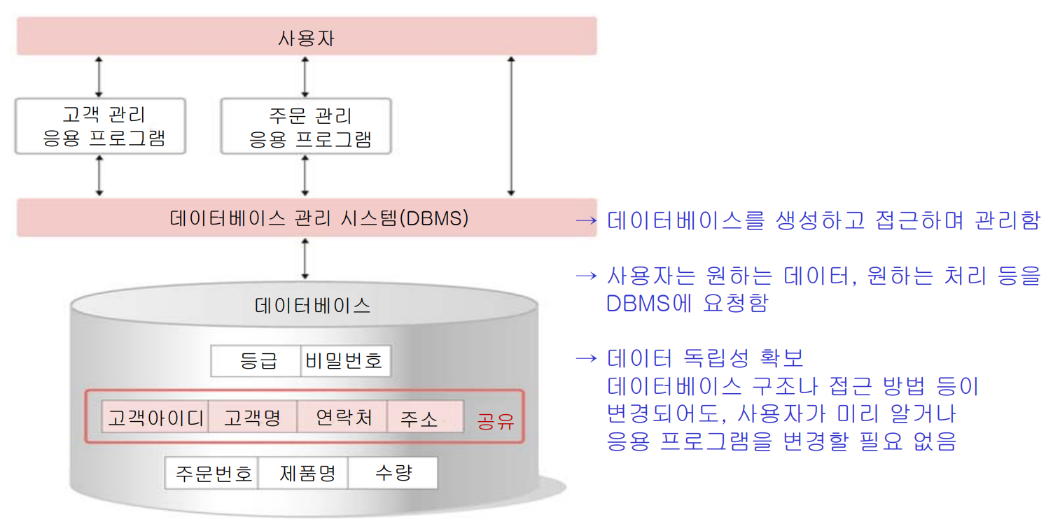 - 조직에 필요한 데이터를 데이터베이스에 통합, 저장, 관리