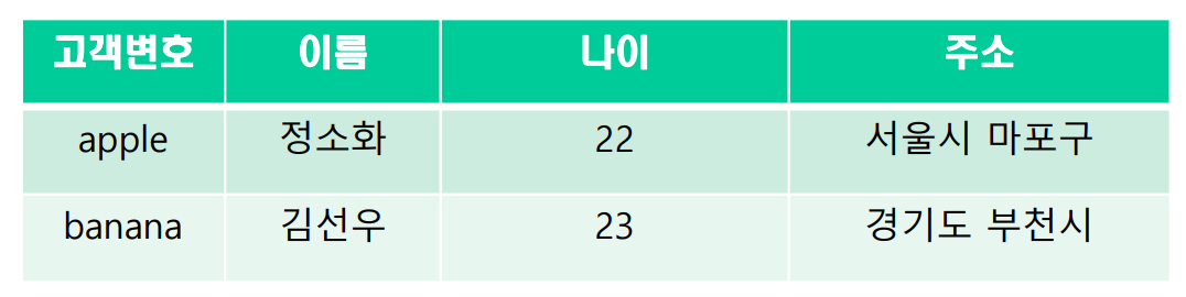 ex) 고객 (고객번호, 이름, 나이, 주소)