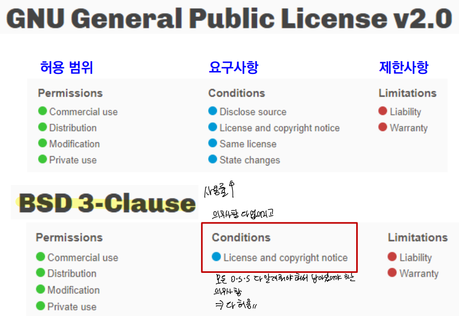라이선스에 따라 큰 차이를 보이는 부분은 '카피레프트'에 관한 부분 -> 제대로 된 공유에 목적을 둠
