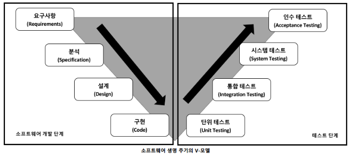 - V모델: 애플리케이션 테스트와 SW 개발 단계를 연결하여 표현한 것