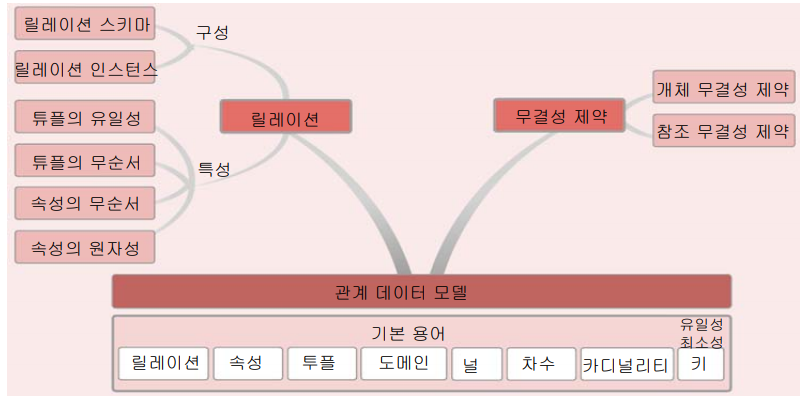 데이터베이스는 릴레이션 여러 개로 구성 - ex) 인터넷 쇼핑몰 DB = 고객 + 상품 + 주문(릴레이션)