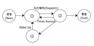 13. 다음은 프로세스 상태 전이도이다. 1,2,3에 알맞은 상태를 쓰시오.