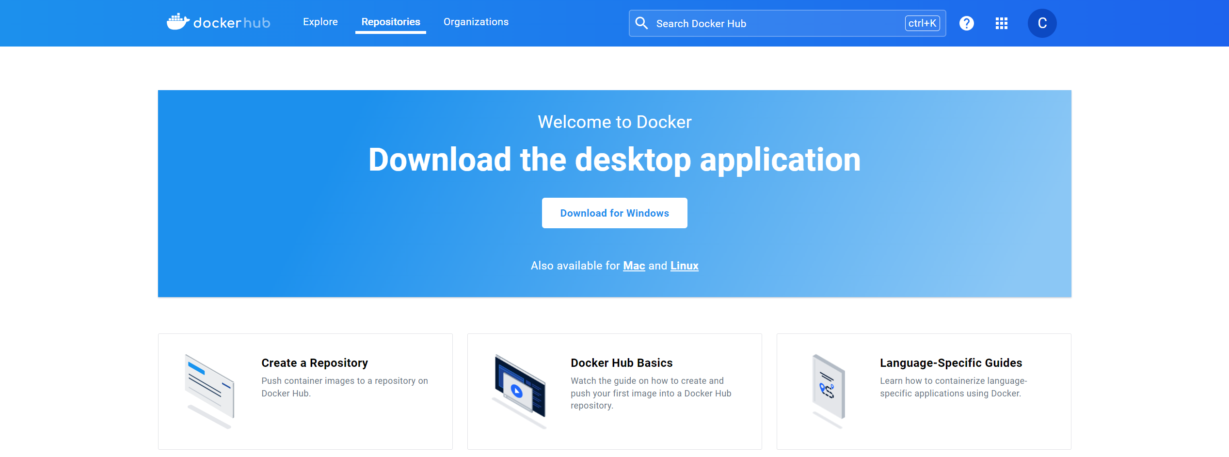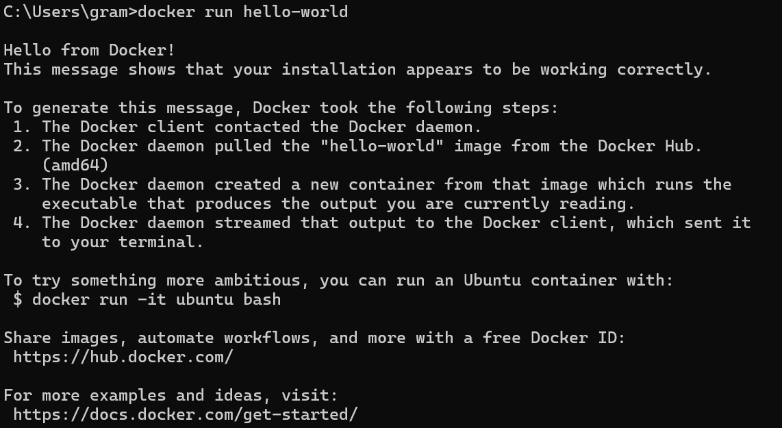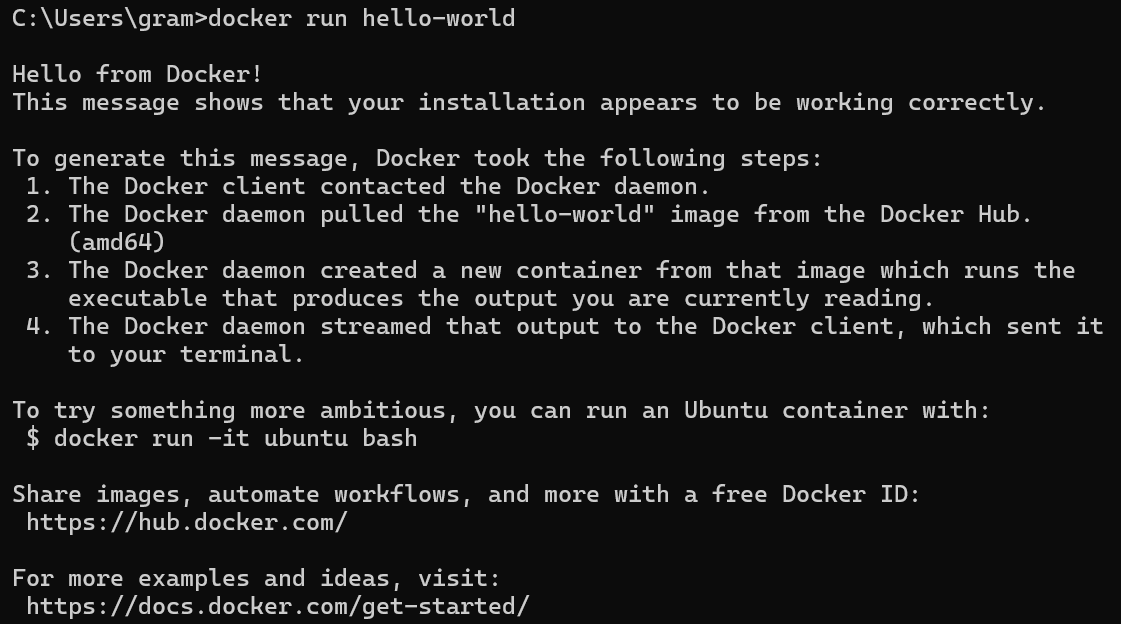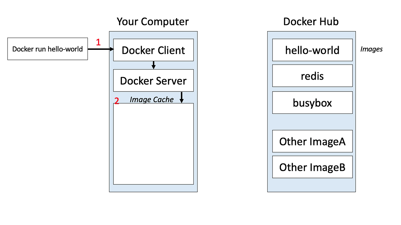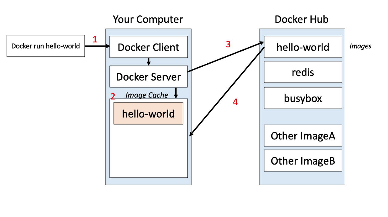 - 도커 이미지가 저장된 도커 허브(Docker Hub)에서 hello-world 이미지를 가져오고, 로컬에 보관