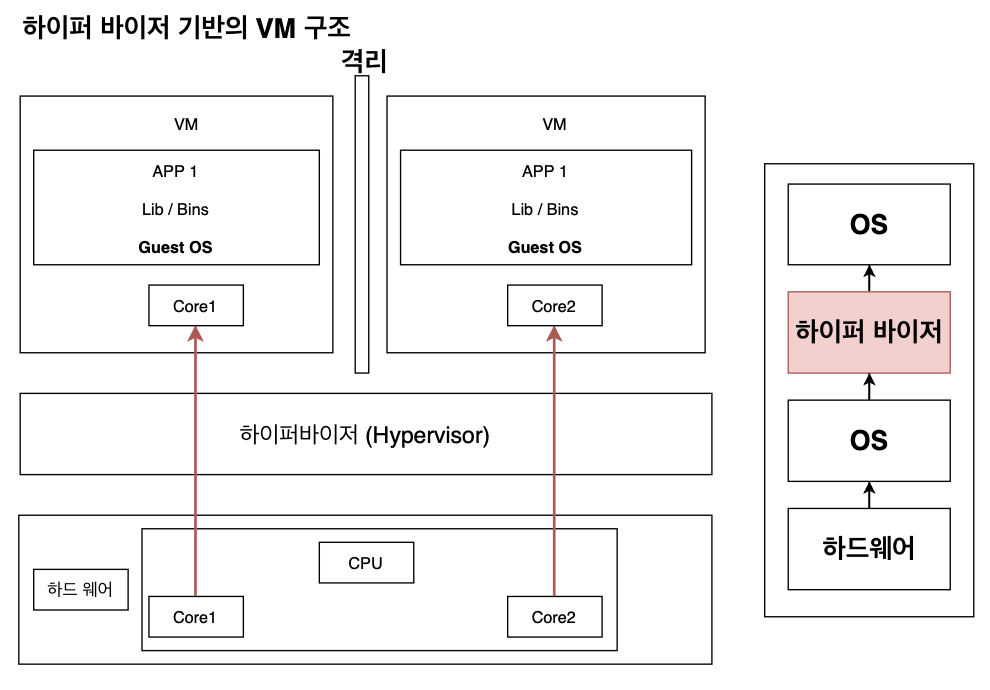 하이퍼바이저가 HW를 직접 제어 -> 자원을 효율적으로 사용