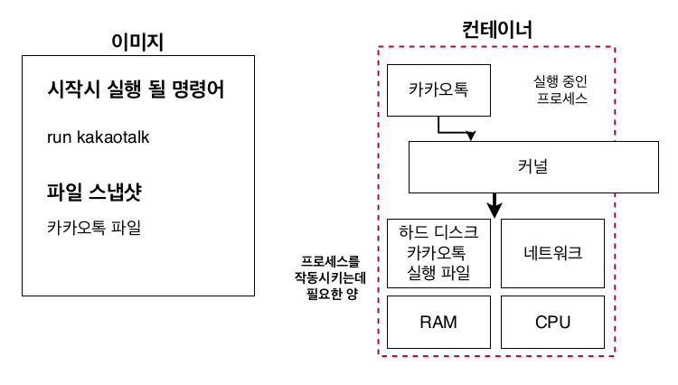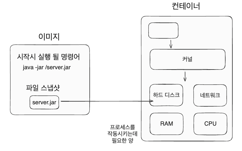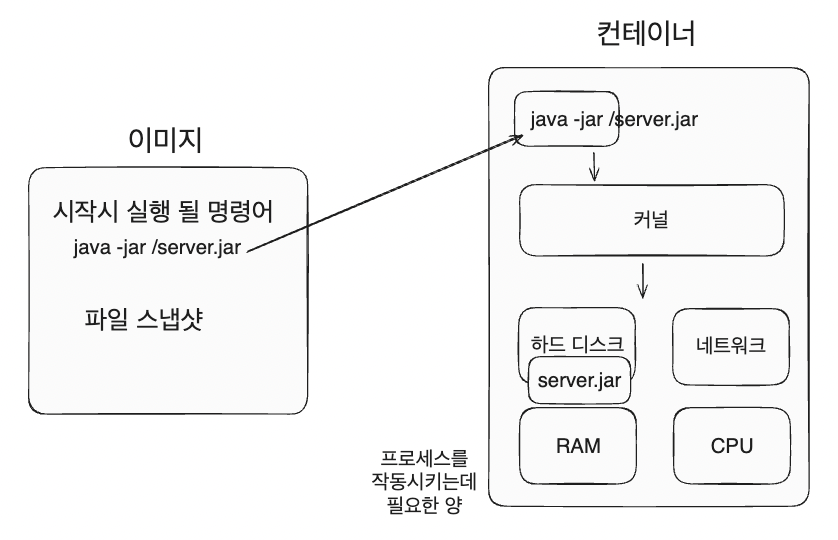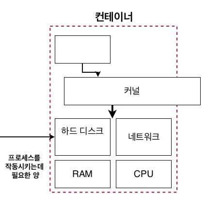 - 커널은 다른 컨테이너와 공유하지만, 하나의 컨테이너는 다른 컨테이너와 격리되어 그 안에서 실행되는 프로세스를 작동시키기 위해 필요한 양에 맞는 하드디스크, 네트워크, RAM 등이 할당돼 있음