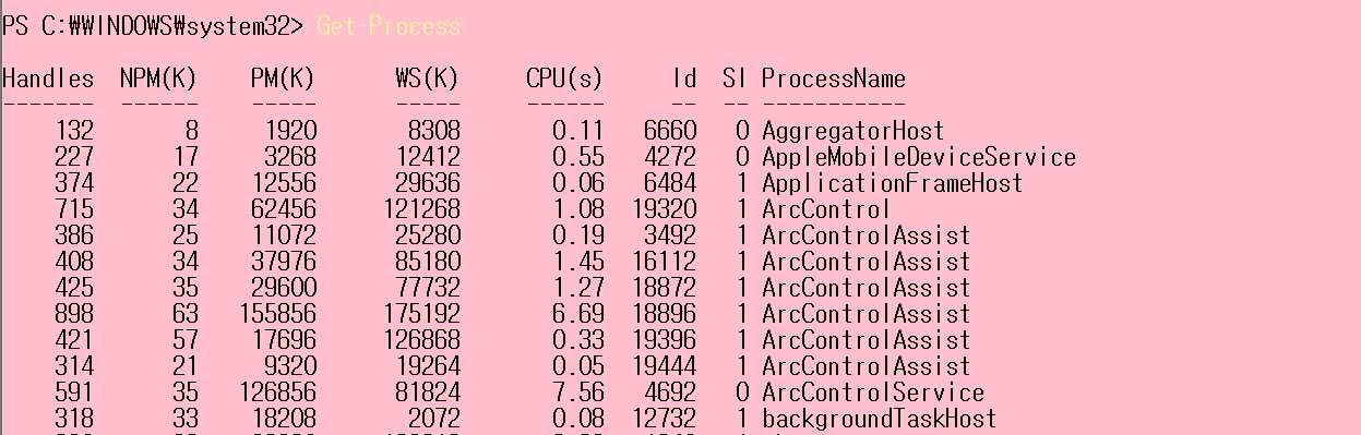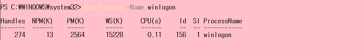 Get-Process -Name winlogon: winlogon 프로세스만 확인