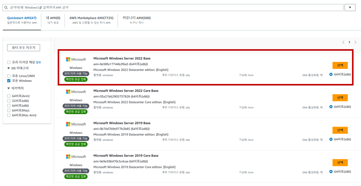 2단계: AMI(Amazon Machine Image) 선택 - Microsoft Windows Server 2022 Base