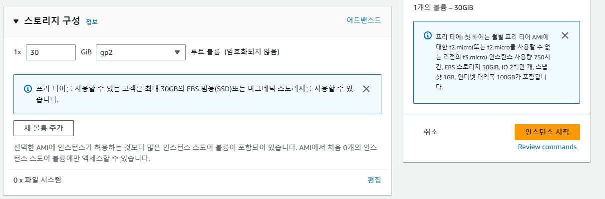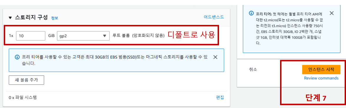 6단계: 스토리지 선택 -> 7단계: 인스턴스 시작