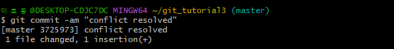 두 브랜치 중 하나 선택 or 두 내용을 수작업으로 수정하여 병합