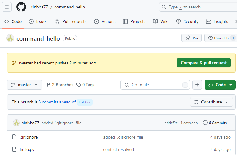 만약 같은 이름의 브랜치가 있는데 서로 내역이 다르면 push 명령을 거부