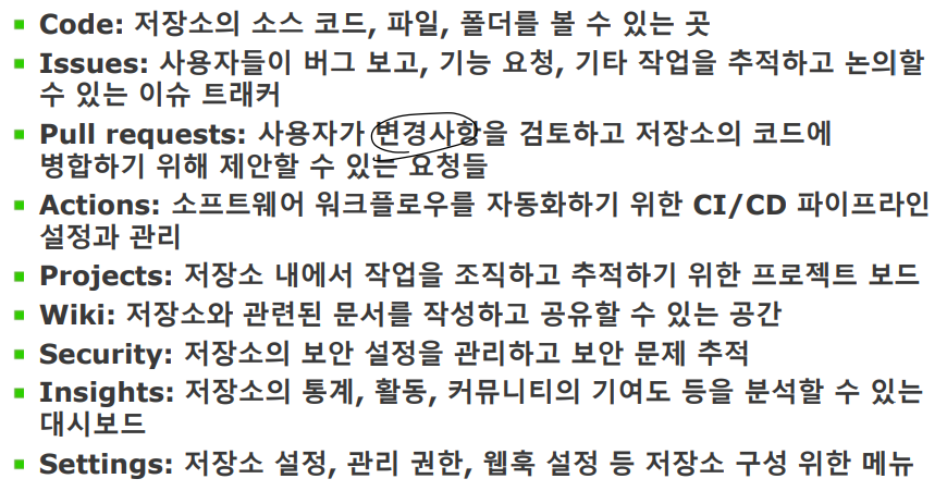 - 이슈(issues): 저장소 안에서 사용자들끼리 문제를 논의하는 기능
